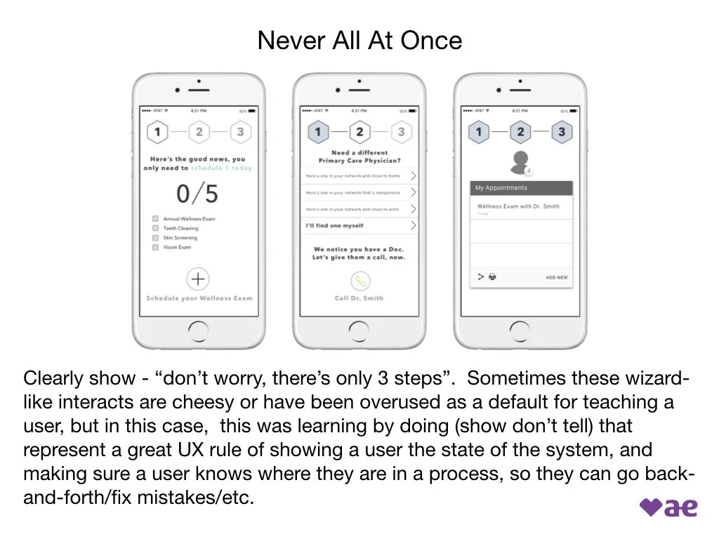 I start with asking a question and while the user tells me personal information, they are rewarded - always feeling important and progressive.
